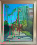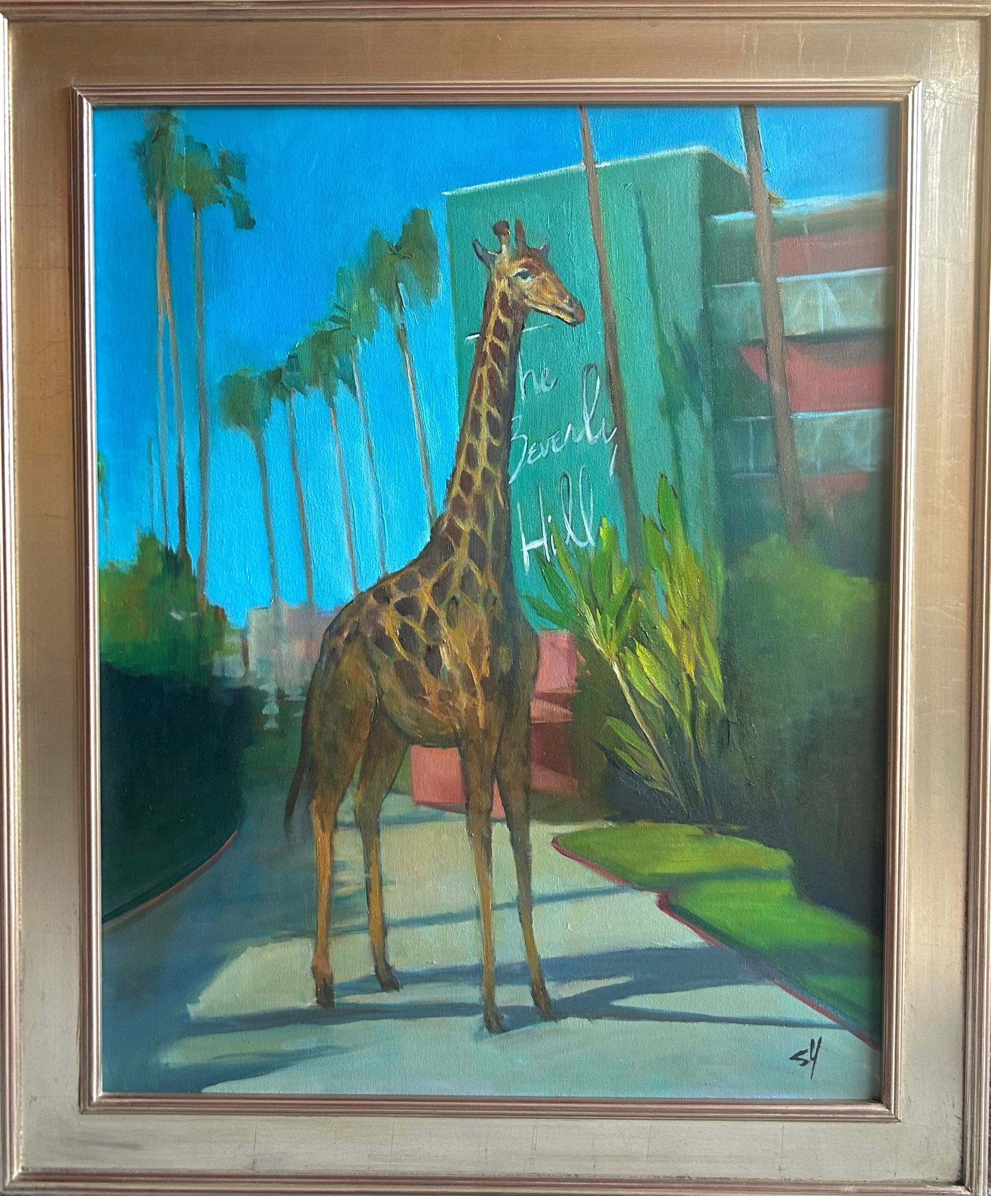 Original oil painting of a Giraffe in front of the iconic Beverly Hills Hotel. 30”x24”. Silver leaf frame included.