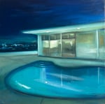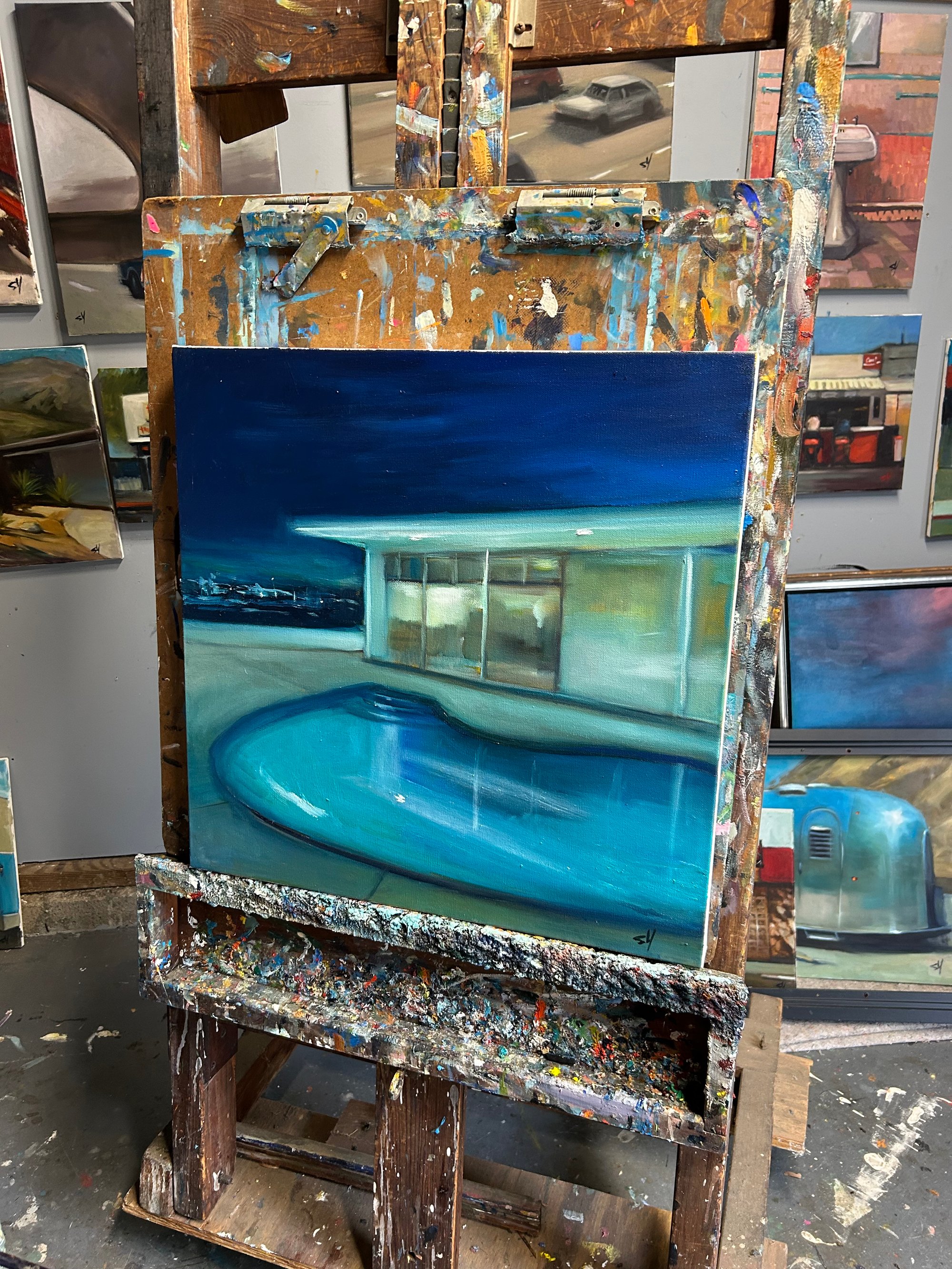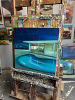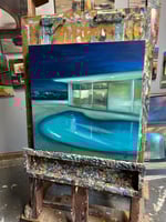 Original oil painting of a MCM home perched up on the Bird Streets in Beverly Hills with City Views. 20”x20” on heavy duty stretched canvas.