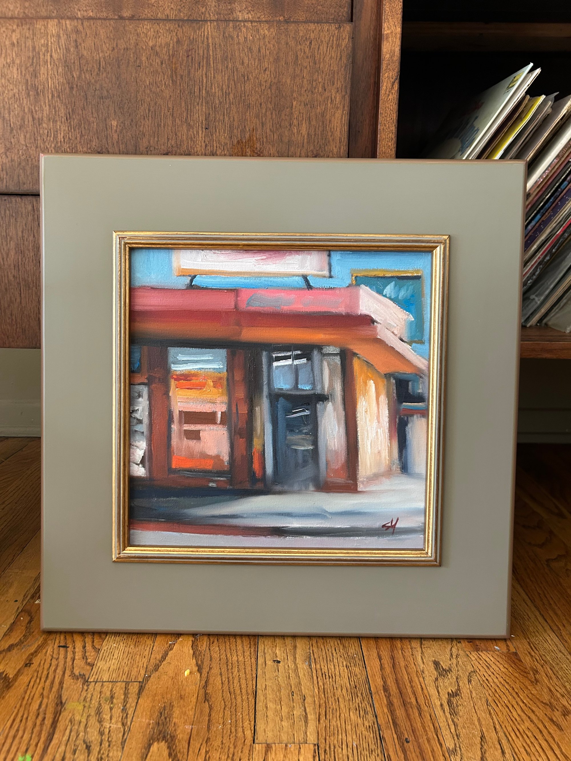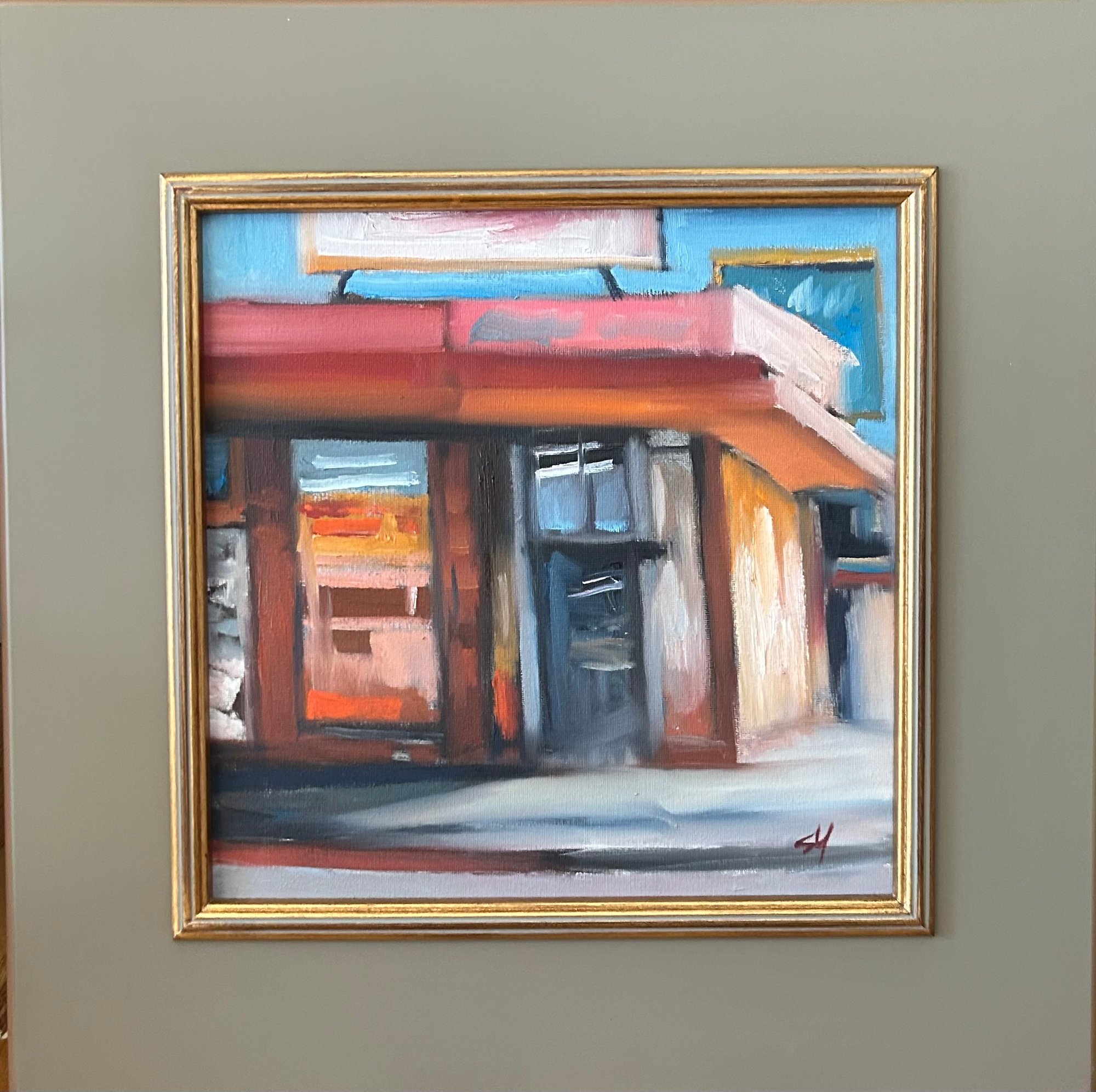 Original oil painting of a corner store in Hollywood. 12”x12” image in a Wendnt Sttle grey and gold frame