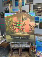 Original oil painting, 32”x32” of a vintage Station Wagon parked in front of an LA home.