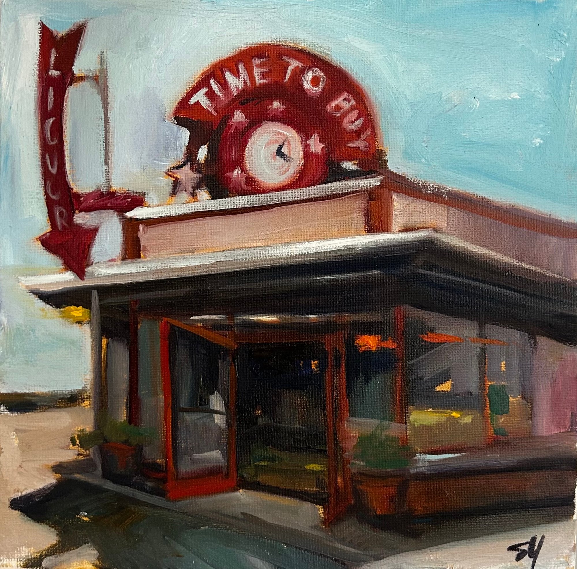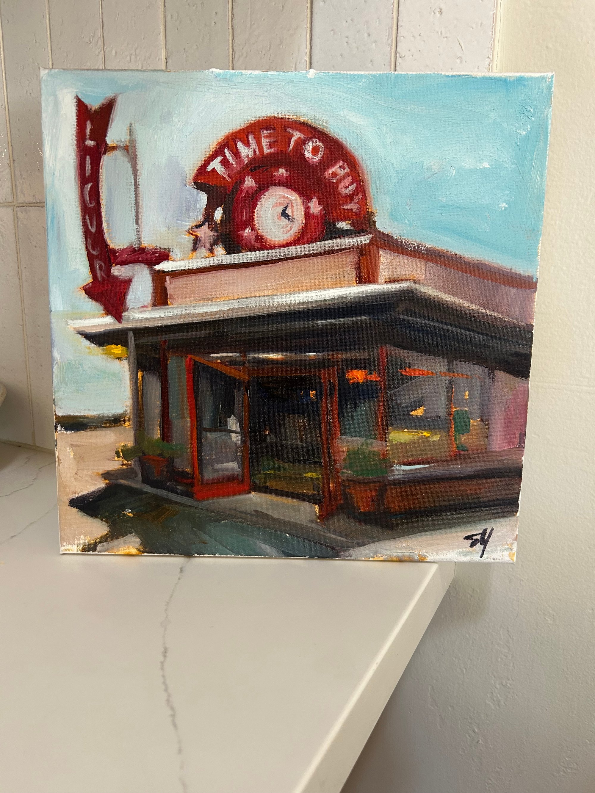 Original oil painting of Encino Park Liquor store and its iconic neon sign on Ventura Blvd. . 12”x12”