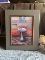 Original painting of a pink and peach vintage bathroom. 16”x12” oil on canvas. Frame included.